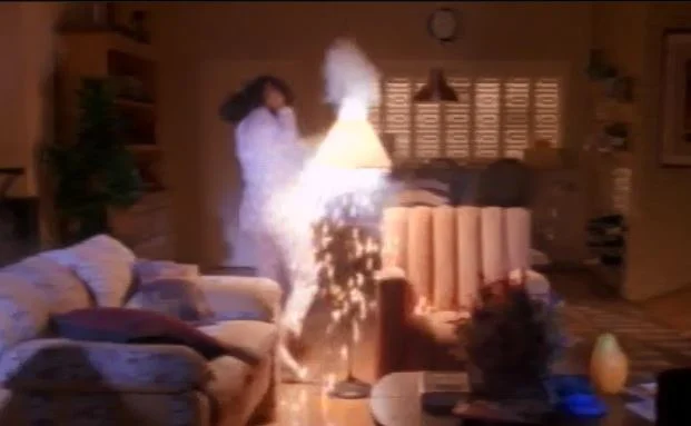When Maxwell returns home, Ravens gives her even further reason to be weirded out, visiting her via a hair dryer, her makeup mirror (which appears to be battery powered thus begging even more questions about Ravens abilities—questions that will only grow more confusing when later Ravens appears to smoke a digital cigar), and the television. After she points a gun at her TV, he either toys with her or fails miserably in his attempts to harm her, blowing up lamps all wither and dither throughout her apartment. An apartment, by the way, that was clearly decorated by an old woman or the set dressers from The Golden Girls. Which, in light of her ridiculous matching pajama set, makes a kind of sense.